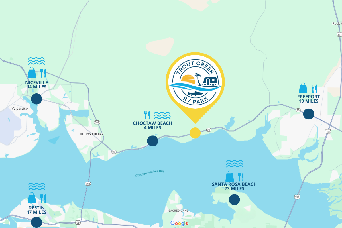 Trout Creek RV Park is your destination RV location near the white sandy beaches of Destin’s emerald coast and the fantastic fishing of Choctawhatchee Bay.